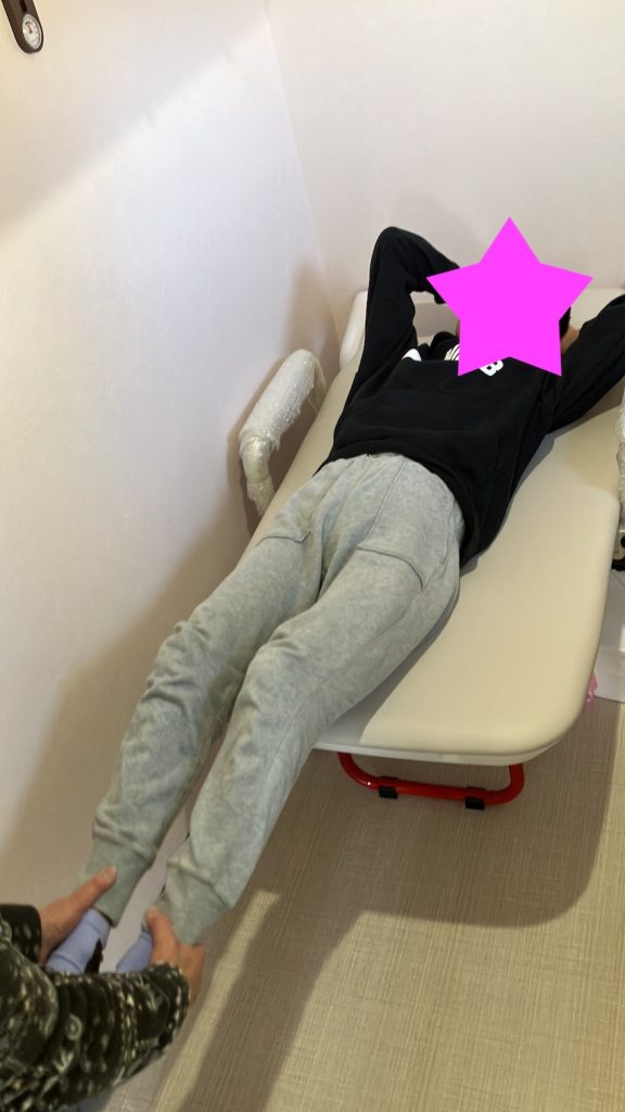ベッドで足を伸ばす運動を行っています。写真のお子様は普段正座や胡座をしている事が多いです。支援中に足を伸ばす機会を作りたいと試行錯誤していました。看護師が写真のベッドに寝ている時はスムーズに足を伸ばしてくれる事を発見してくれました。積極的に行っていきたいです。