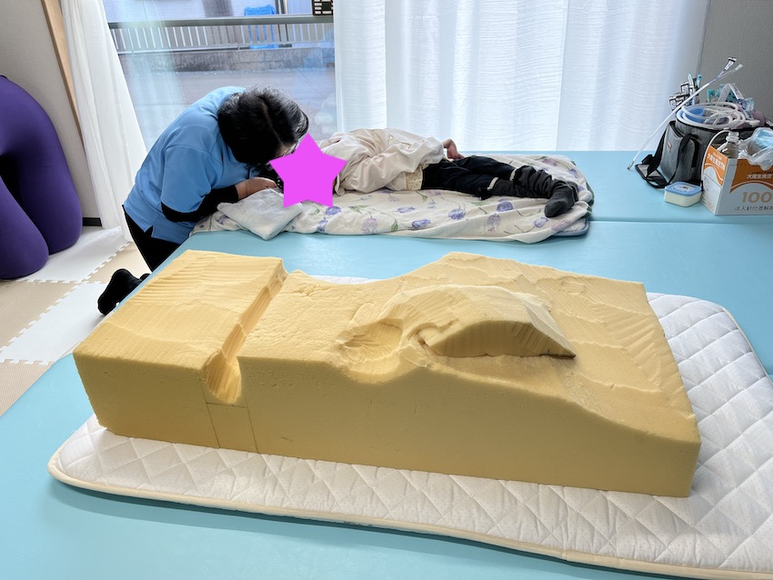 写真ではうつ伏せクッションが写っています。ウェルスマイルで使用しているものが身体に合わなくなったので、つばさ静岡で再作製中です。丁度今日から春休みですので、学校で使用しているものをお借りしました。約40分うつ伏せを行いながらストレッチをして、仰向けになった直後の写真です。この後首のストレッチを行いました。ストレッチを行っている最中は笑顔がたくさん見られ、体調も戻ってきた様子です。