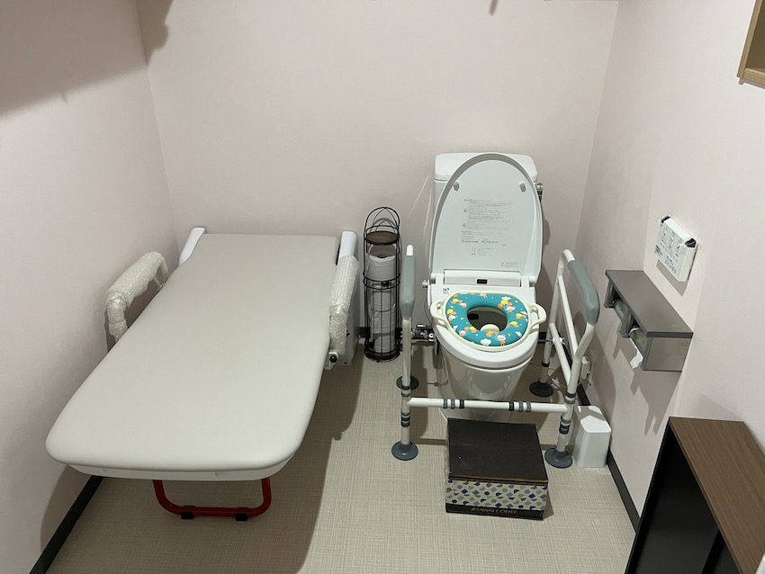 この一言で図面を変えました。そして写真のようにトイレを広くして介助用ベッドを取り付け、手すりと子供用便座を用意しました。