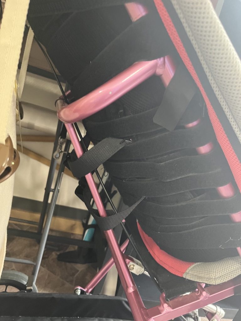 背もたれのベルクロのコツとしては、下(腰方向)に行くほど張りを強くする事です。そうする事で座位が安定します。また、側弯のあるお子様もいますので、側弯の状態を見ながら調節します。