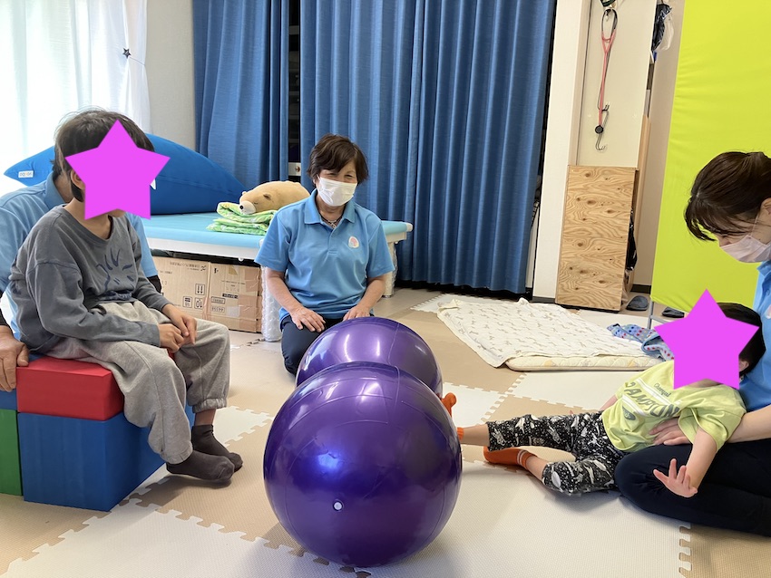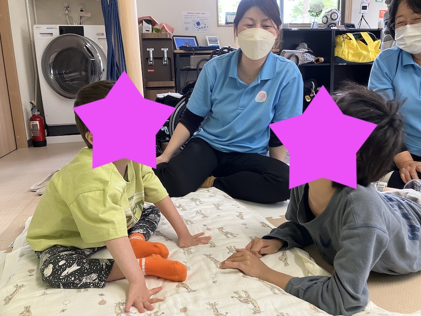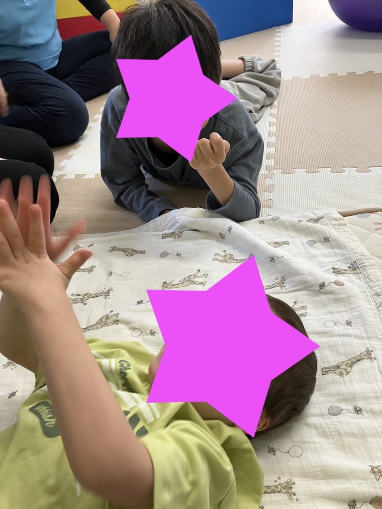 二人で仲良く顔を見合わせる場面が多く見られました。また、お兄さんは後輩を応援しています。人に関心が出てきました。仲間と触れ合うことも大切な療育です。