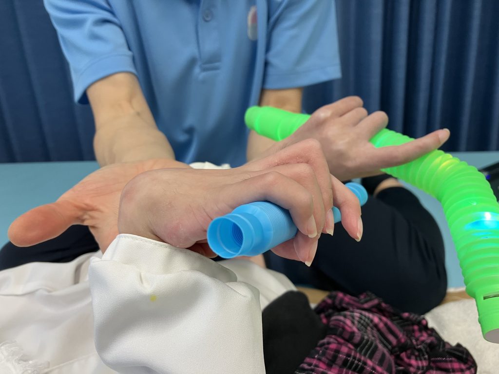 写真は両手にポップチューブを持たせています。チューブなので筒状に握ります。指全体で握るように誘導していますが、手のひら全体で握る事が可能となりました。