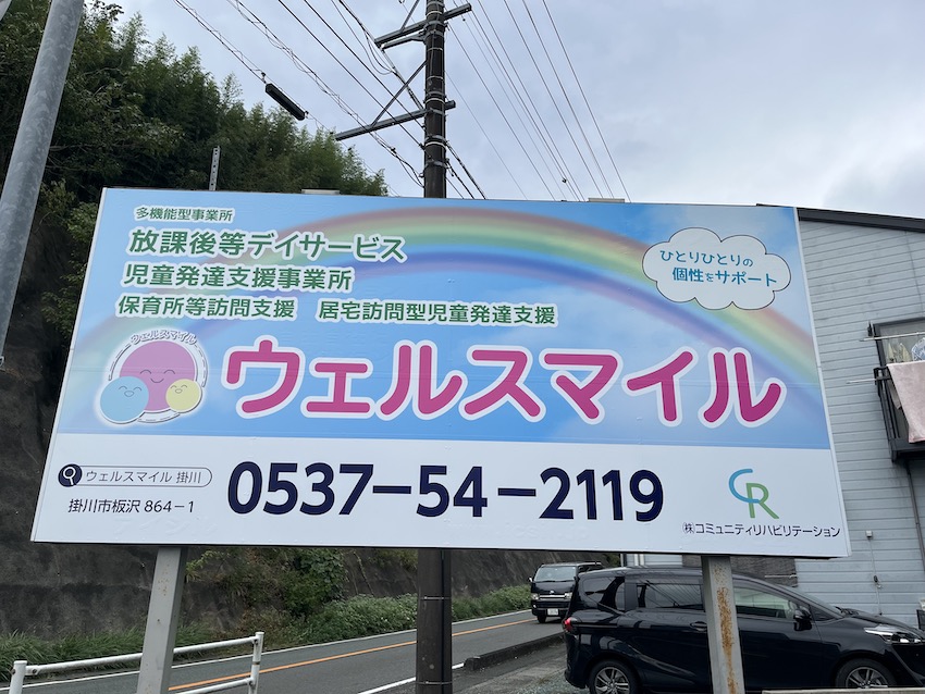今日のアイキャッチ画像をご覧いただきましたか?事業所の掛川大東線(西側道路)沿いにウェルスマイルの看板が出来ました。表裏同じ看板ですが、特に掛川方面から来るとすごく目立ちます。