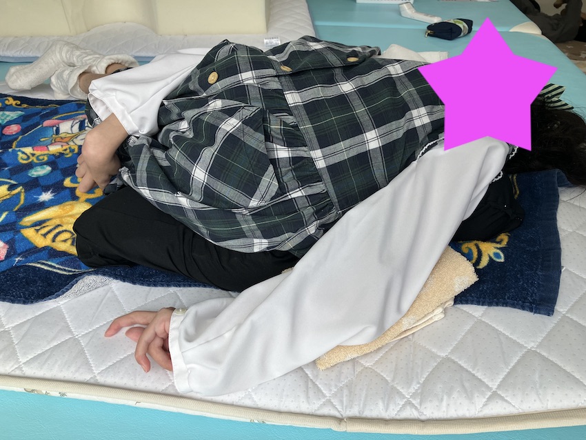 保護者の方にお子様の好きなことを聞きながら、いろいろチャレンジしたところ、先日ベッドの上までは誘導することができました。本日は寝る様に誘導したところ、写真のようにベッドに寝てくれて、しかもストレッチまで行うことができました。