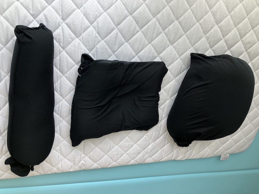 ウェルスマイルのスタッフがクッションを自作しました。ビーズクッションを小分けにして体に合わせた形にしてあります。