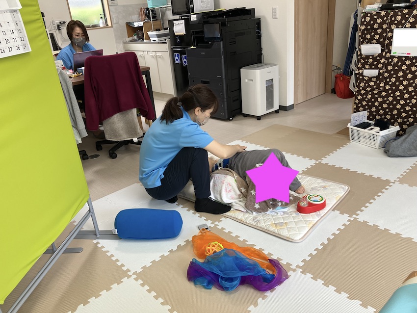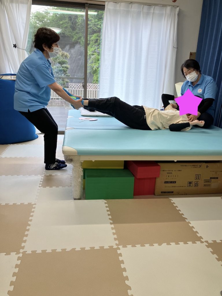 看護師が足のストレッチをしています。写真のお子様は普段正座をしていることが多く、足が固くならない様に1日数回足を伸ばすことが必要です。ウェルスマイルではトイレのベッドと車椅子から立つ時に足を伸ばすことを行い回数を確保していました。もう少し赤い数を増やしたいと考えており、ベッドで寝てくれないかと思っていましたが、なかなかうまく誘導できませんでした。