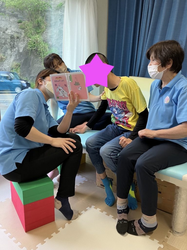午後からの支援の高校生です。普段は床で正座している姿勢が多いですが、職員がいろいろ工夫をして、ベッドに上がる事まで誘導してできる様になりました。写真はベッドに足を垂らして座りながら保育士による読み聞かせを行っているところです。