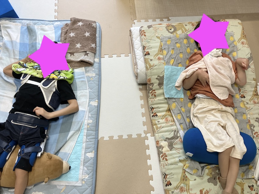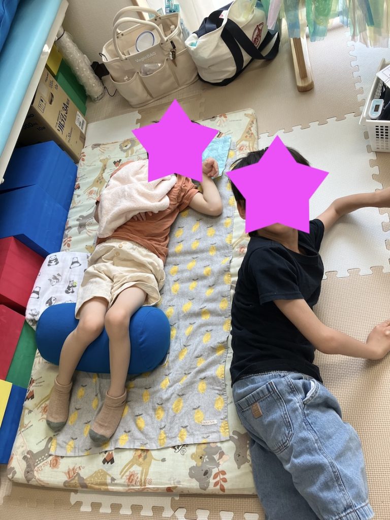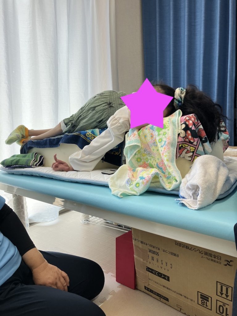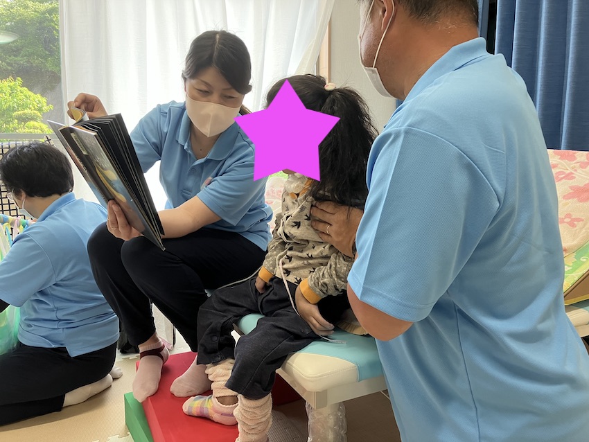話を戻しますが、写真は絵本を読み聞かせしながら座る練習をしている場面です。顔をお見せできないのが残念ですが、絵本をジッっと見ています。その間に座りながら肩甲骨の動かしました。大変リラックスできた様子で、呼吸も深い呼吸になりました。