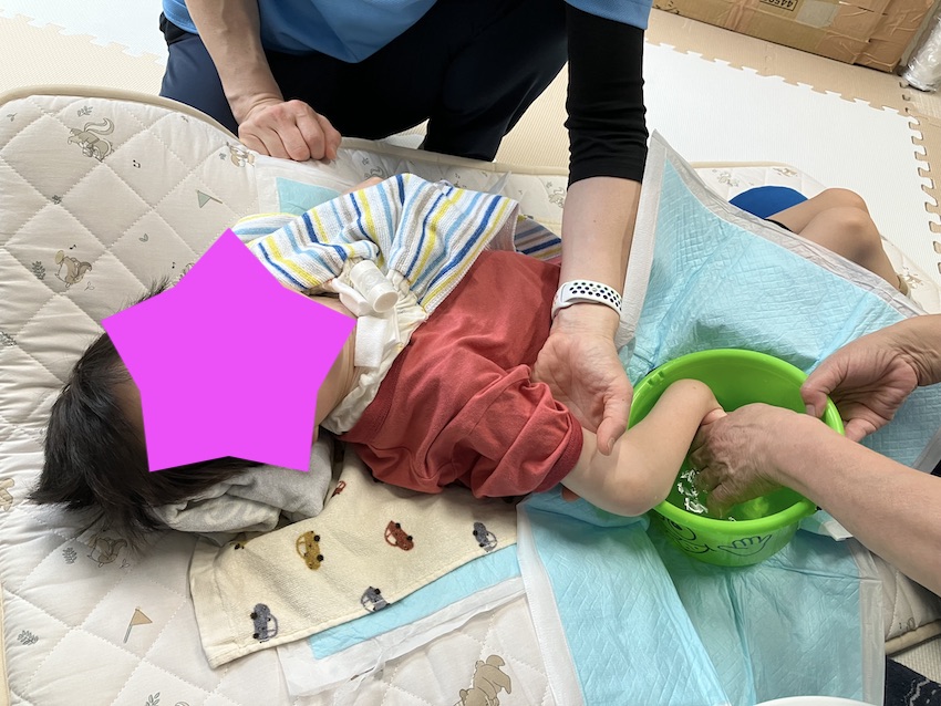 今日は手浴・足浴を行いました。とても気持ち良さそうな笑顔が見られました。水の感触が好きなのか、緊張も和らぎリラックスできた様子です。