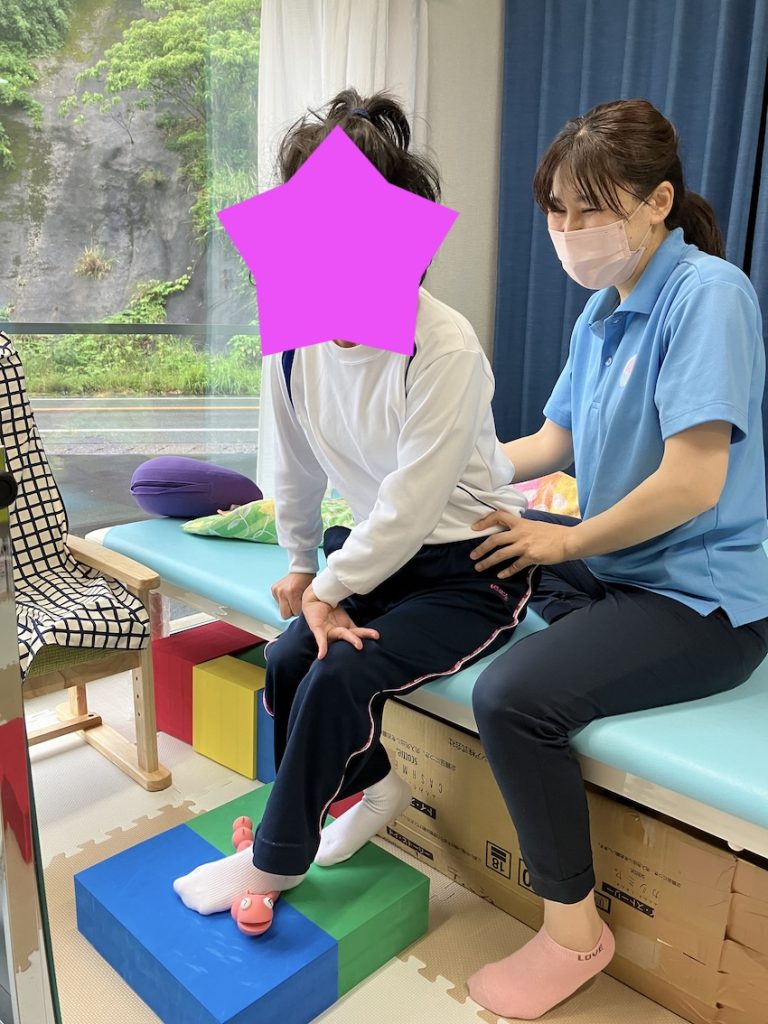 学校でクッションなどを踏む自主トレをしているという情報をもらいました。ウェルスマイルでも座りながら足を付く目的で、音のなるおもちゃを踏む練習を左右それぞれの足で行いました。姿勢良く座って課題を行う事が出来ていました。学校での様子を聴取しながら、ウェルスマイルでもできることを積極的に行なっていきたいです。