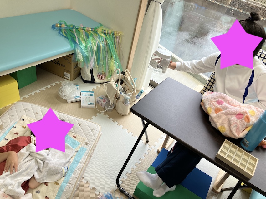 座っているお子様が鈴が入った容器を振って音を出しています。その音に寝ているお子様が反応しています。放課後等デイサービスは、色々な年代のお子様が空間を共有できる事がメリットの一つです。コミュニケーションの手段は言葉だけではありません。そのような事を感じさせてくれた場面でした。