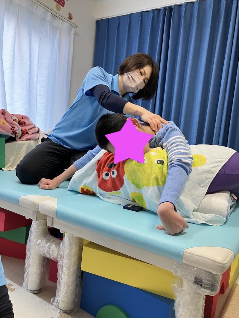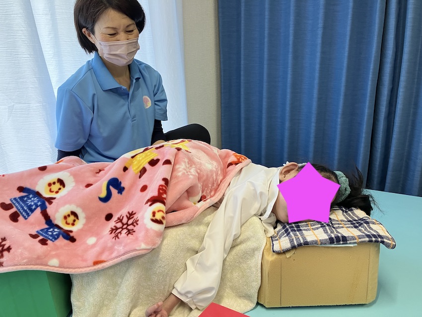 うつ伏せを行っている時に肩甲骨の動きを良くする運動をおこなっています。重症心身障害児の場合、バギーに乗っているか仰向けで寝ている事が多いです。そうすると必然的に肩甲骨が床や背もたれに接している状態です。肩甲骨が接している状態が続くと動きが悪くなります。したがって、1日1回は肩甲骨を開放してあげる事が必要です。その意味で、積極的にうつ伏せや背もたれなしの座位などを行うことは大変意味があることです。