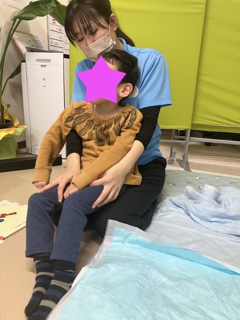 装具をつけてうつ伏せをした後、少し休んでから座位をとりました。理学療法士が背もたれがわりになり体幹の角度を調節しながら約10分ほど行いました。座位を取ると突発的な刺激が入らない限り、頭を不随意的に動かすことが少なくなりました。一つひとつの姿勢が安定してきました。それと、yes/noの答えがわかる様になってきました。意思疎通が少しづつですが確立していた様に感じます。