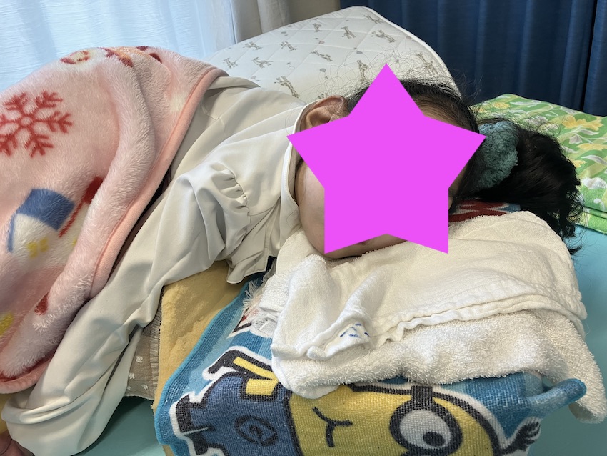 今日は下校が15時30分でしたので、うつ伏せを中心にゆっくり過ごしました。うつ伏せを行うと聴覚からの刺激が入りやすいため、積極的にうつ伏せを行っています。ストレッチをしている時の今日は終始笑顔でした。