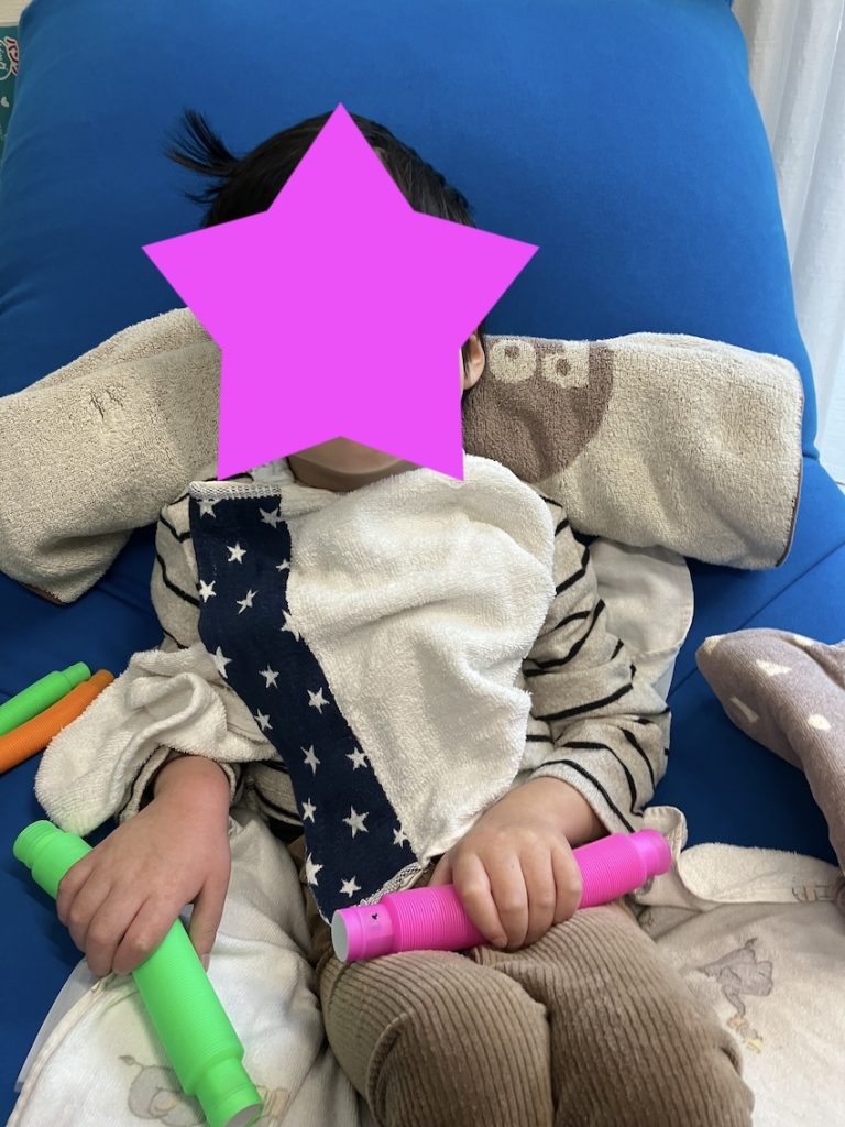 Yogiboを使って座位をとっています。体調が今ひとつ戻りきれていないので、本日は背もたれを使って座位を行いました。少しでも重力に抗した姿勢をとる事が重要です。また頭が前に垂れてしまうと猫背を強調してしまうので、背もたれに少し角度をつけています。このように体調に合わせて療育を行っています。