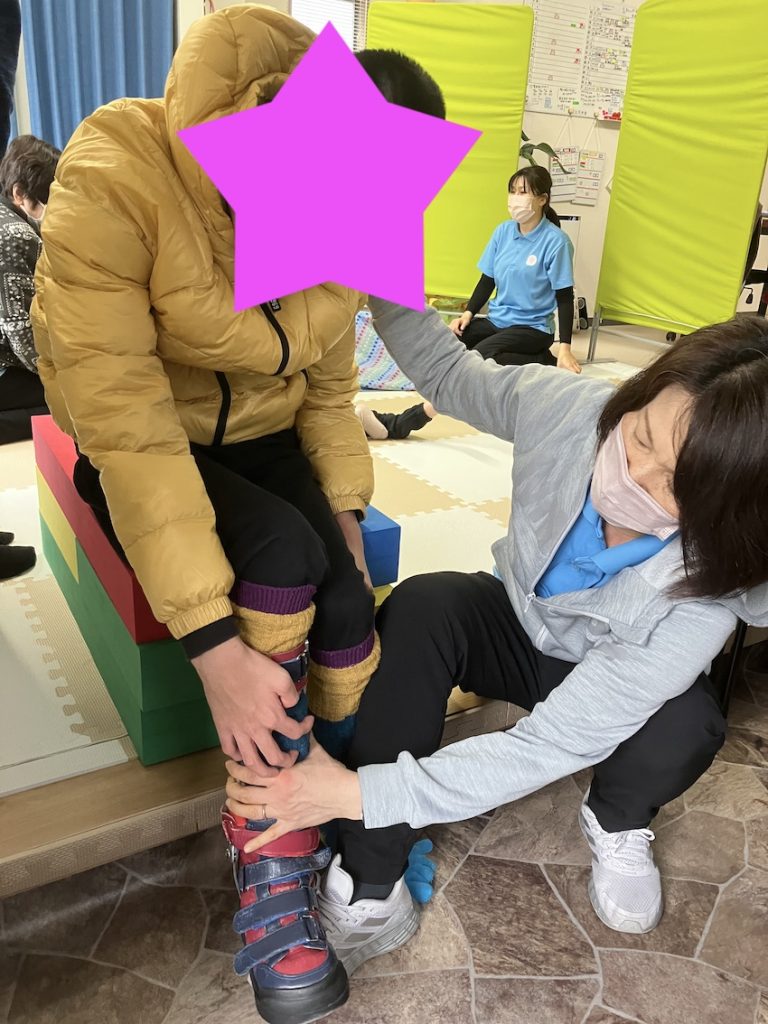 車椅子から台に座って装具を取る練習をしています。ウェルスマイルに来た時と散歩から帰ってきた時の2回行う様にしています。少しづつですがベルクロを取るのが上手になっています。本日保護者様にこのことをお話しし、ウェルスマイルから台を貸し出してご自宅でも無理のない範囲で実施していただく事となりました。療育は事業所のみで実施するのは意味はなく、如何にご家庭で実施できるかがポイントです。その様な情報共有を行っていきながら、本人の「できる」を増やしていきたいです。