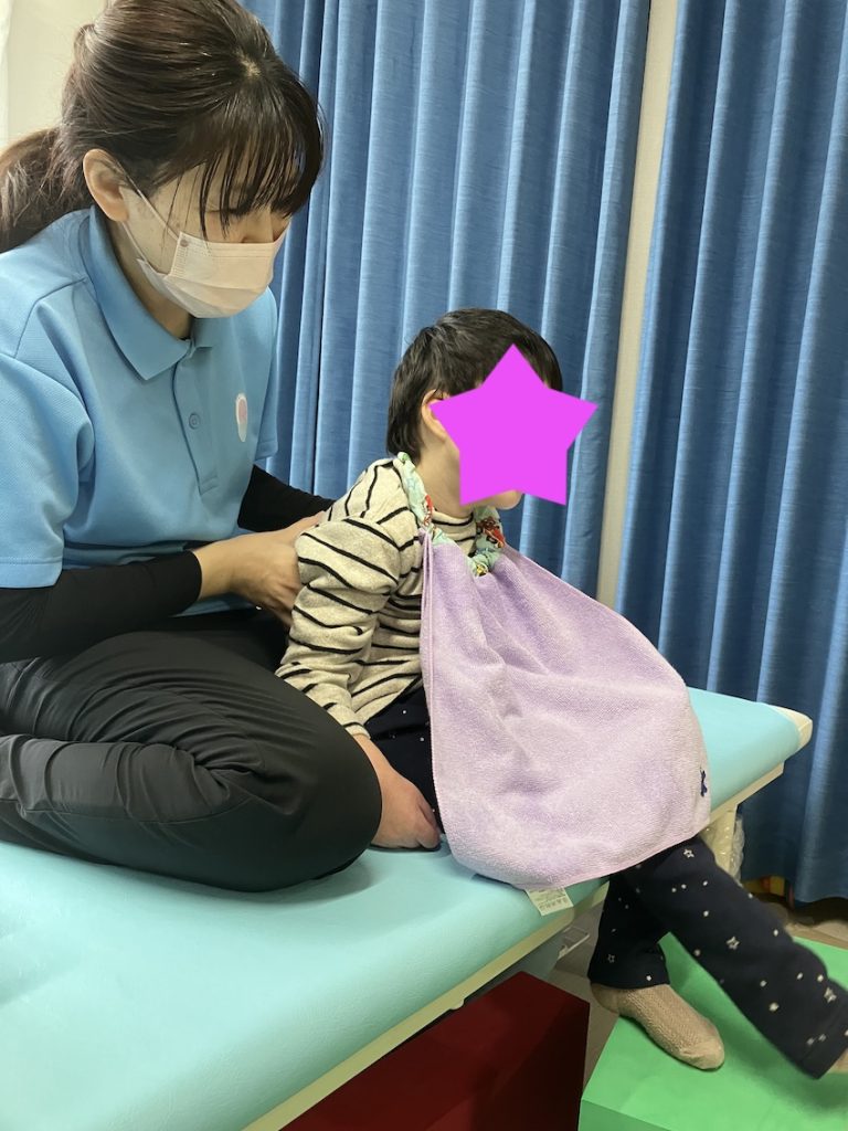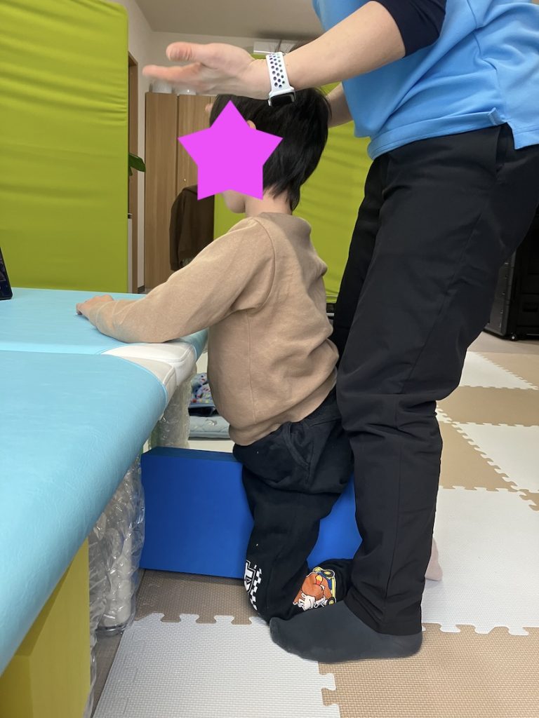 装具を着けて立位と歩行をしているお子様です。立位姿勢をもっと良くするために、膝立ちを行いました。膝立ちだと骨盤の動きが出て良い姿勢になります。まずは膝立ちを行い、その後立位・歩行の流れで療育を行いたいです。