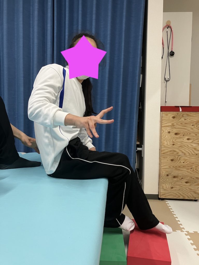 足のストレッチを行った後に背もたれなしで座りました。写真では分かりづらいですが、顔を上げて背筋を伸ばして座る時間が増えてきました。骨盤のコントロールが上手になってきたのが主な要因です。ストレッチ後は特に腿裏の筋肉が柔らかくなるので、良い姿勢を取りやすいです。