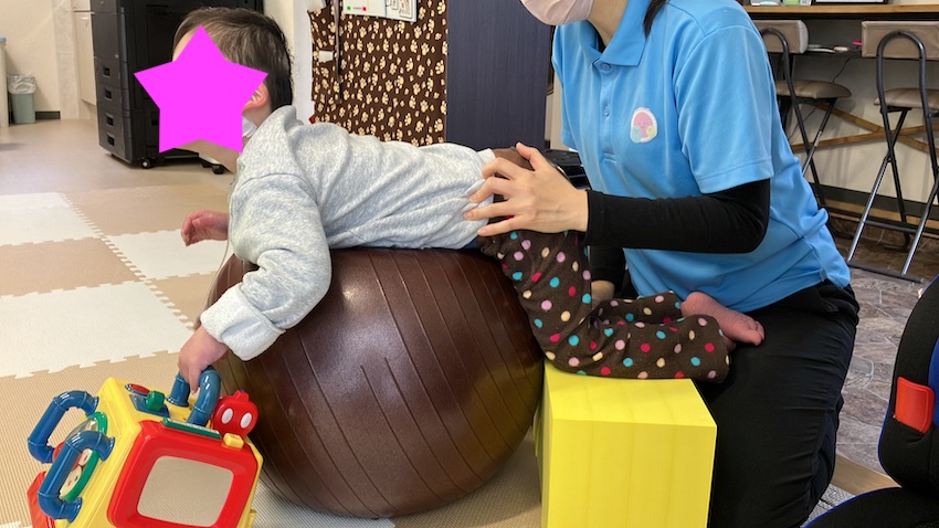四つ這いの練習をする前に、バルーンを使って膝に体重をかける練習をしました。骨盤を介助して実施しましたが、膝に体重を乗せるのが上手になりました。四つ這いは股関節と膝関節を90度に保つ事が求められます。この姿勢を保つためには運動コントロールの能力の向上が必要です。運動のコントロールを向上させるためには、触覚や体重負荷などの感覚入力の経験を効率よくたくさん行う事が必要です。ウェルスマイルでは療育を通して、その子に今必要な感覚をたくさん経験できる様に行っています。