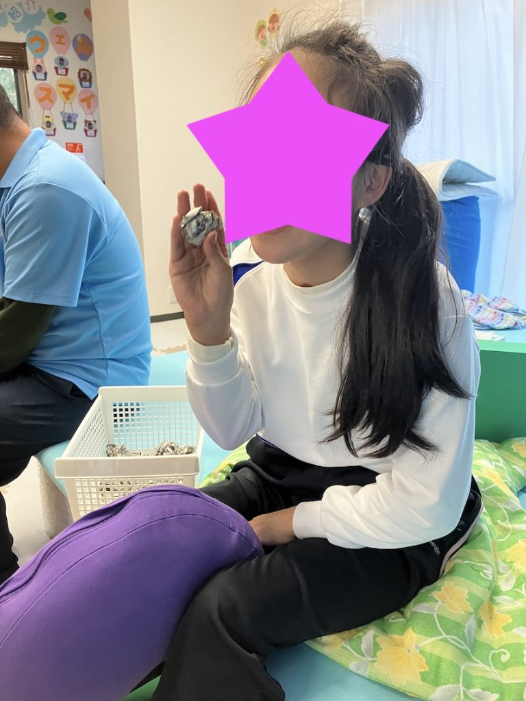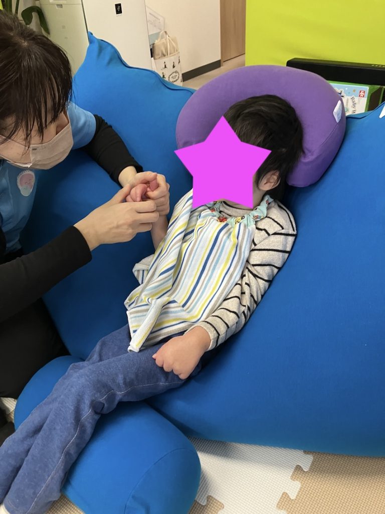 呼吸の状態もいつもよりゆっくりで深い呼吸になっていました。やはり、リラクゼーションをしながら療育を行うことは非常に重要です。またお子様の身体の特徴を把握し、リラックスできる姿勢を見つけて実行するのも理学療法士の得意な分野です。今後も継続して実施していきたいです。