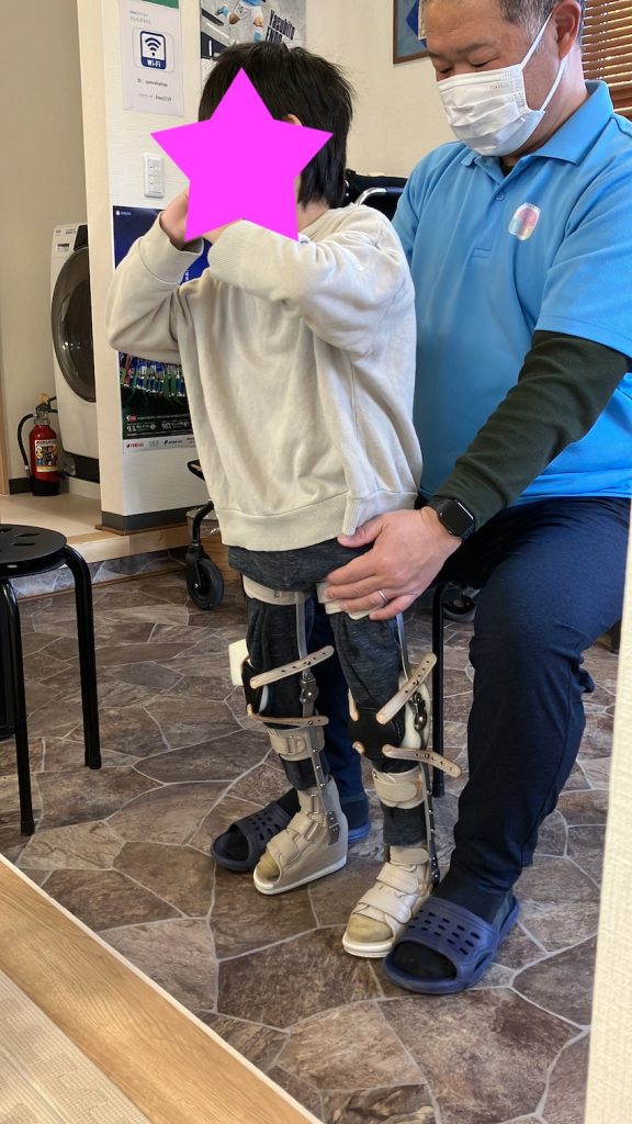 装具で立つ練習をしている様子です。少し前方にわざとバランスを崩して立つ練習をしています。これには理由があります。