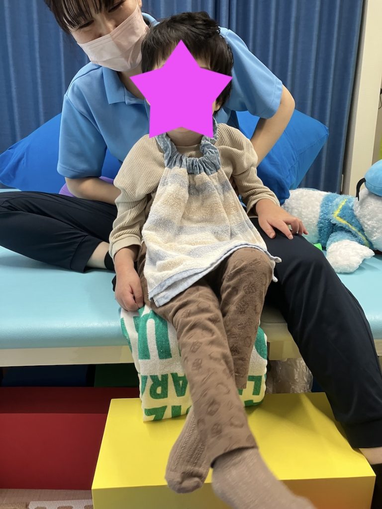 まだ円背姿勢がありますが、少しづつ重力に抗した姿勢が取れる様になってきました。前回も書かせて頂きましたが、重力に抗した姿勢が取れる様になると、感覚入力が飛躍的に向上して覚醒レベルも上がります。学校の授業も覚醒レベルが上がった状態で受けられるようにウェルスマイルでも支援していきたいです。