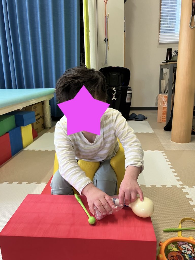 続いての写真です。最近おもちゃを両手で持って顔に近づける様子が頻回に見られました。今日は自ら両手でおもちゃを取るようすがみられました。顔を隠しているのでお見せできないのが残念ですが、目で手を見ています。目と手の協調が少しづつ出てきました。この良い反応をたくさん出していきたいです。療育で大切なことは、一瞬の良い反応の積み重ねだと考えています。最初はほんの少しの反応かもしれません。その経験の積み重ねが、やがて一つの動作へと繋がっていきます。大事なことは、その良い反応を見逃さない観察力だと考えています。