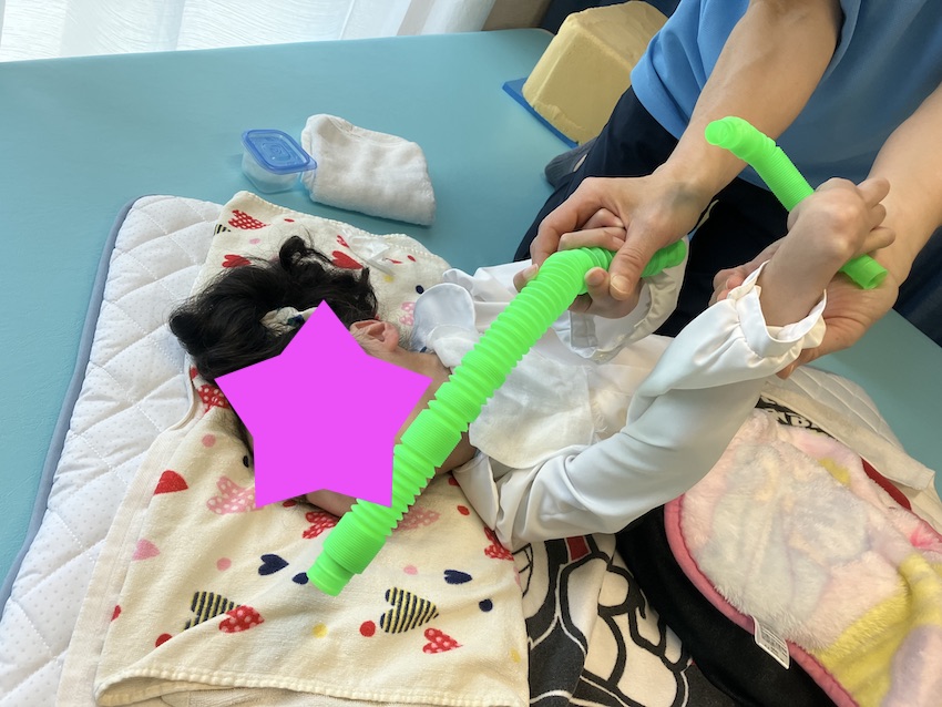 写真はうつ伏せを行った後、両手にポップチューブを持ちながら上肢のストレッチと視覚誘導を行った様子です。関節を動かしている感覚(固有感覚と言います)を入れながら、視覚刺激を行なっています。以前と比べ目でポップチューブを追う様になってきました。理想は手を見せてあげたいです。その為に、頸部と上肢のストレッチを無理のない範囲で継続していきたいです。自分の身体を見る事は成長にとって欠かせない事です。少しづつですが手が顔に近づいています。日々変化しているのが実感できるので大変嬉しいです。