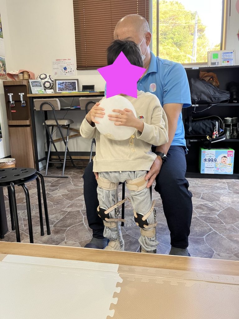 この後、体重を片足に乗せるように誘導して片足立ちと歩行訓練を行いました。歩行訓練は足の振り出しの介助を行えば歩くことが可能です。積極的に立位・歩行訓練を行い、それが生活動作へとつながる様に療育を実施していきたいです。理学療法士が常駐している事業所だからできる療育です。
