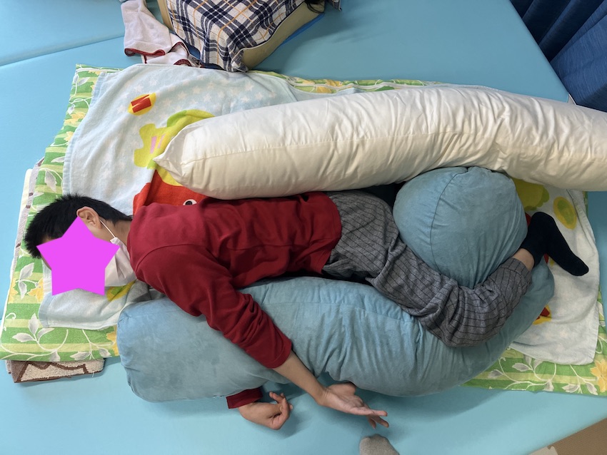 先ほど姿勢のバリエーションを増やしていく事も療育に必要と書きましたが、それにプラスしてリラックスできる姿勢を見つける事も療育の一環です。写真のお子様は頭の角度で全身の筋緊張が変わってしまいます。特に頭が右後ろに伸展すると、全身が突っ張った緊張になってしまいます。