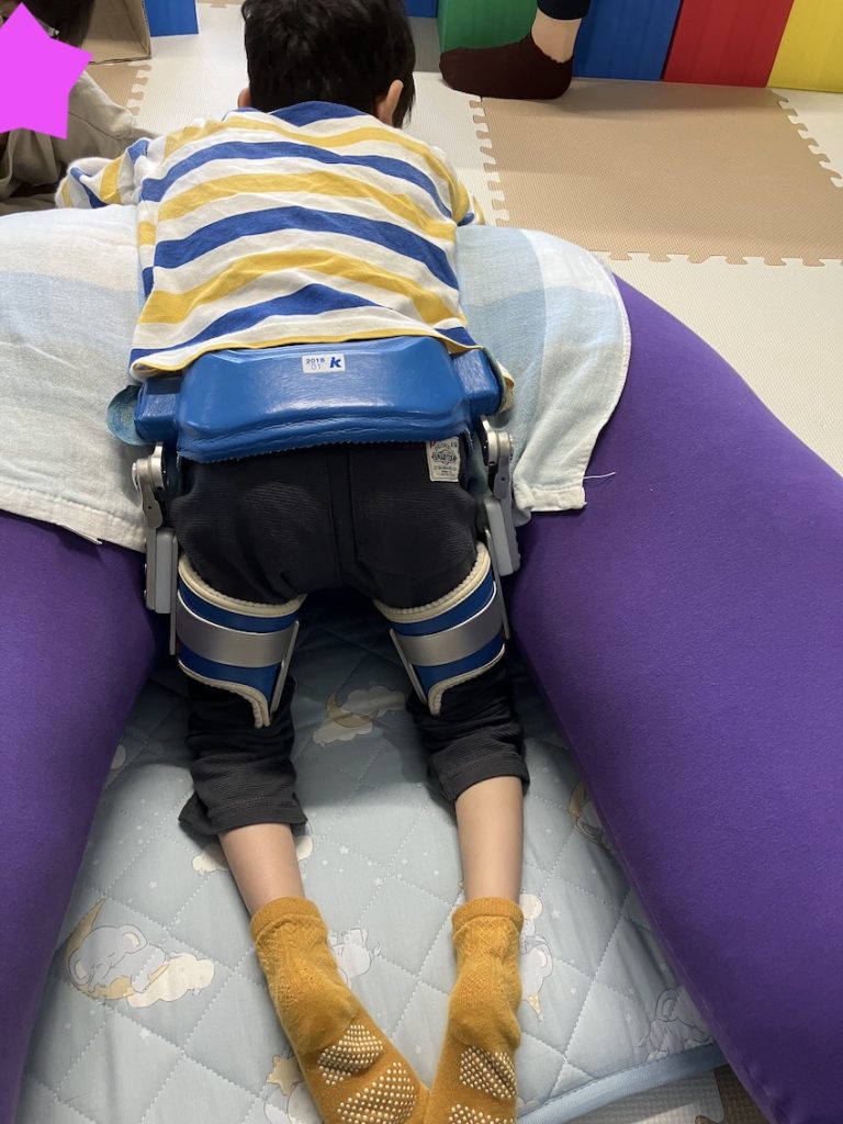 股関節の成長は体重をかけることが一番です。股関節の脱臼肢位に注意しながら、無理のない範囲で体重をかけていきたいです。このように体の成長に合わせて姿勢調整をしていくことも療育の一環です。