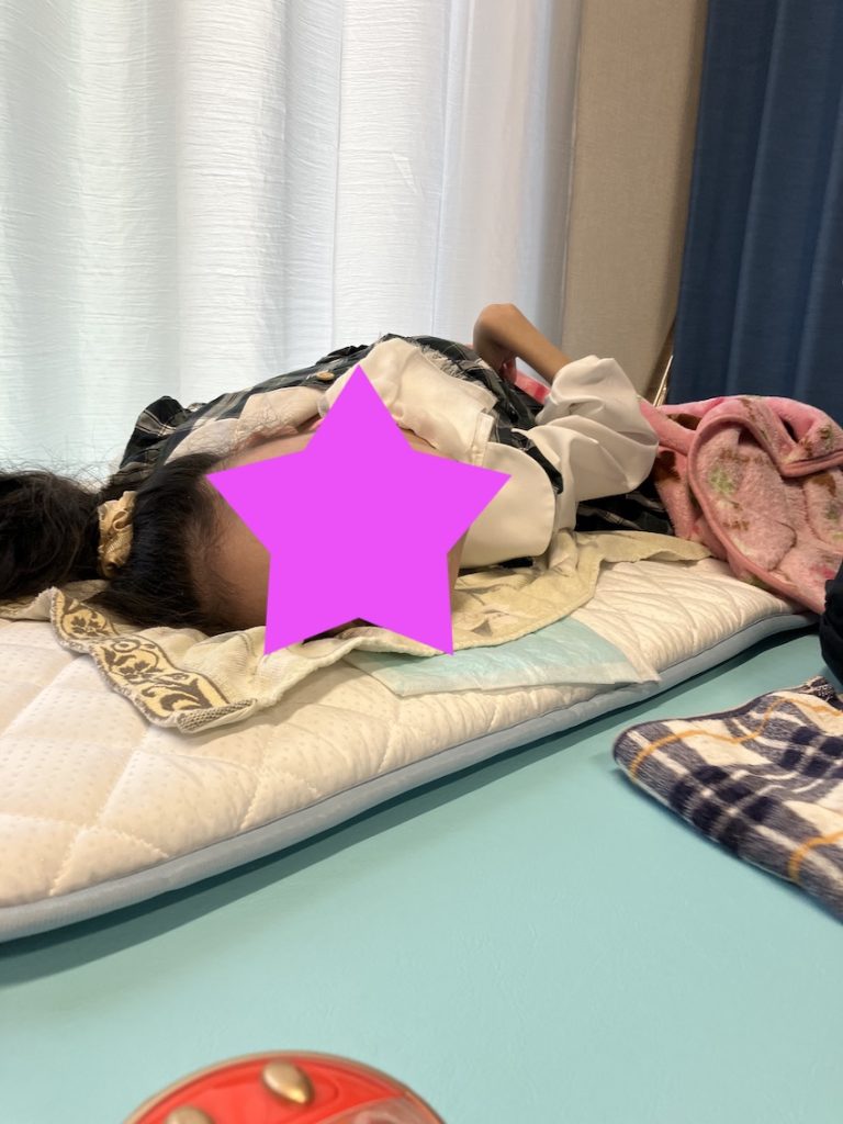 うつ伏せを行った直後の写真です。写真では分かりづらいですが、今日は両上肢の緊張が低くストレッチがしやすかったです。ここ数日非常にリラックスできています。姿勢の変化にも柔軟に対応できているので、次回あたりから新しい姿勢にチャレンジしようと考えています。姿勢のバリエーションを増やしていくことも療育です。