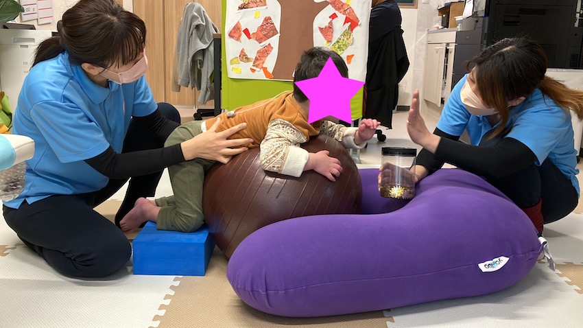 足側に理学療法士、頭側に保育士が居ます。保育士が「タッチ」を促して背筋を伸ばす様に誘導しながら、理学療法士が骨盤をコントロールしています。