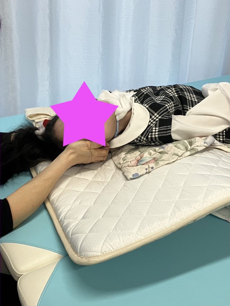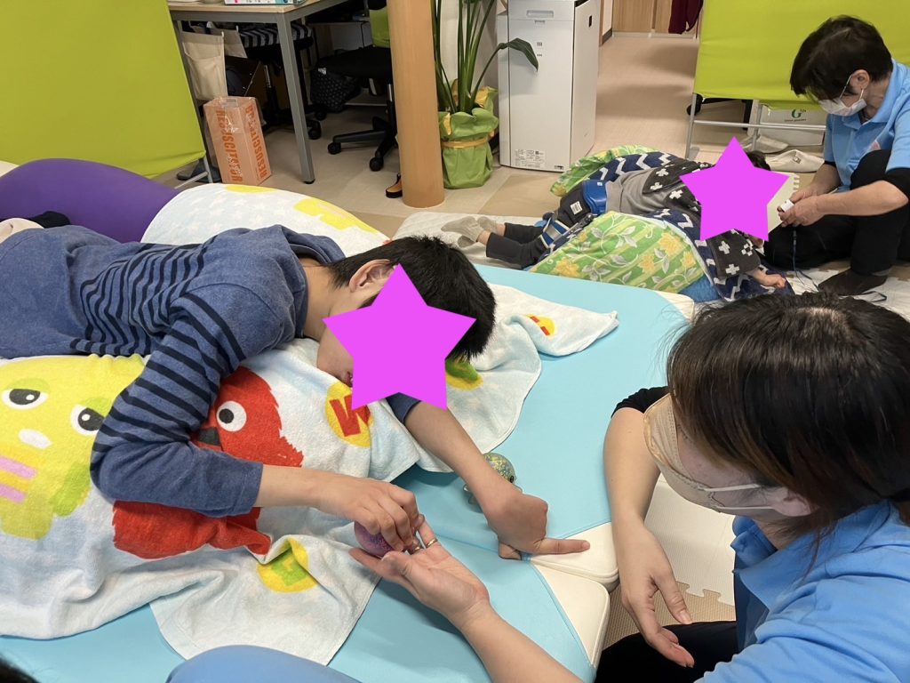 続いてはうつ伏せと仰向けをおkなっているお子様です。うつ伏せ終了後に仰向けで首回りのストレッチを行いました。写真では少しわかりづらいですが、今日は左が下になる様な側臥位をしています。これからの目標として、「仰向け・うつ伏せ以外にも姿勢を取れる」ことを行なっていきたいと考えています。姿勢の選択肢が増えることはお子様にとって有意義な事です。その一つに「視野が広がる」があります。仰向けは上、うつ伏せは下が主な視線となります。横向きで寝ることができると水平面での視野が確保できます。視覚の刺激がたくさん入る様になるので、療育の可能性が広がります。これからは横向きを少しづつチャレンジしていきます。