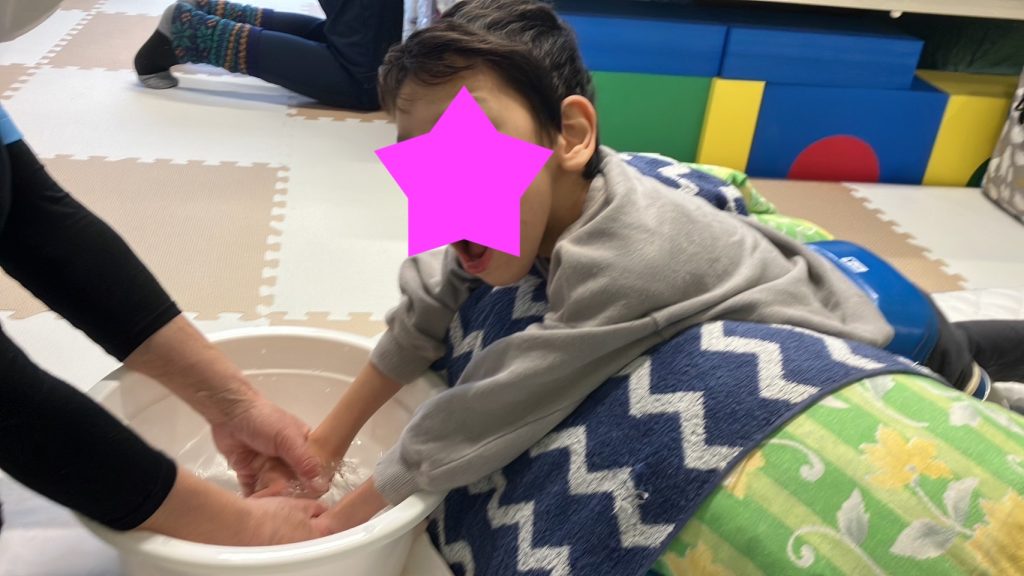 うつ伏せをとる目的には様々あります。写真のお子様の場合、股関節に体重を掛けることが目的の1番です。したがって、頭を上げて背筋が伸びると股関節に体重が乗るので、背筋が伸びるように手浴を行いました。個人情報の関係で顔を見せられないのが残念ですが、大変良い表情をしています。