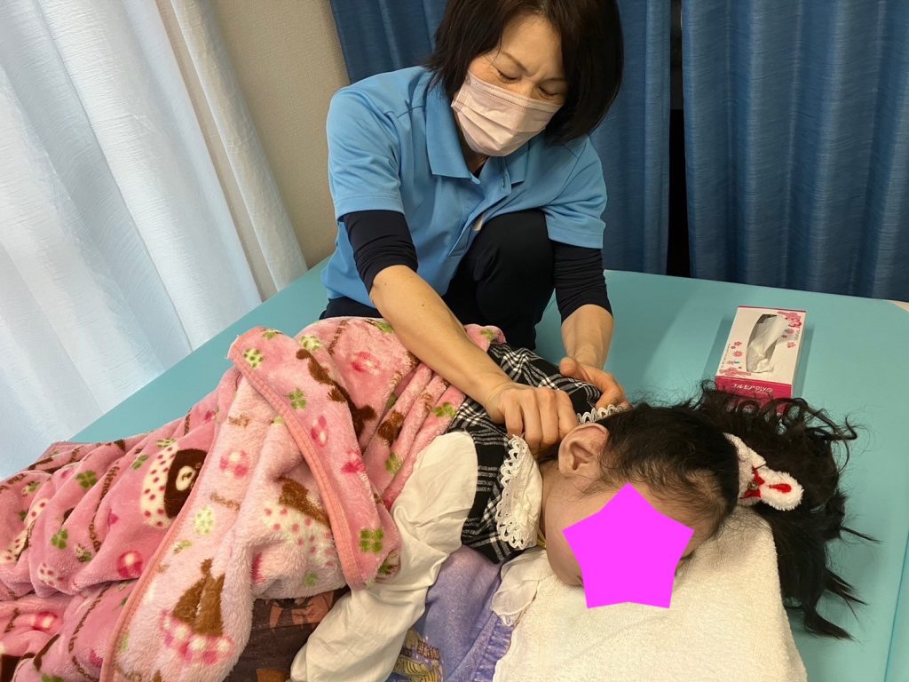 うつ伏せを行っている最中に肩甲骨周りと肩関節を中心にアプローチを行いました。写真のお子様は先日まで体調が優れなかったので、少しお休みをしていて久しぶりのご利用でした。数ヶ月前でしたら硬さが戻ってしまっていましたが、今回は関節の柔らかさも休み以前と変わりなくストレッチしやすかったです。これも以前から継続していた成果が出たと考えます。