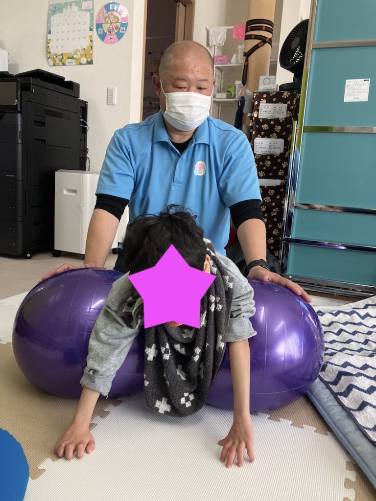 ピーナッツ型のバランスボールでうつ伏せを行っています。写真ではわかりませんが、膝で体重を受ける様にセッティングしています。そして重要なポイントは床に手が着いていることです。手に体重を乗せる目的として、手の発達を促すことと肩甲骨に体重をかける事で、座位の姿勢の安定性を促す事です。うつ伏せはリラックスする目的でも行いますが、同じうつ伏せでも目的によってうつ伏せの方法が変わります。色々なうつ伏せにチャレンジしていきたいです。