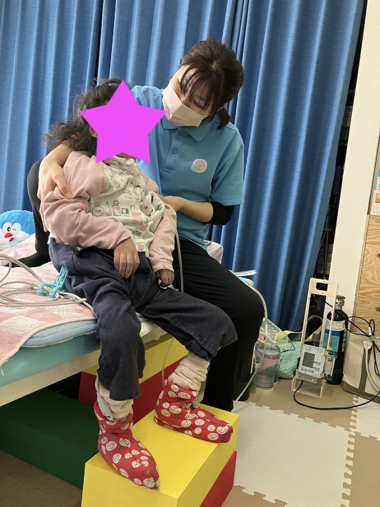 本日は5分ほど座位を行いました。理学療法士が背もたれ代わりになっています。顔をお見せできないのが残念ですが非常に良い笑顔です。呼吸の状態や酸素の状態も特に問題ありませんでした。次回の支援の時はうつ伏せなどを行って、色々な姿勢を無理なく取れる様に支援していきたいです。