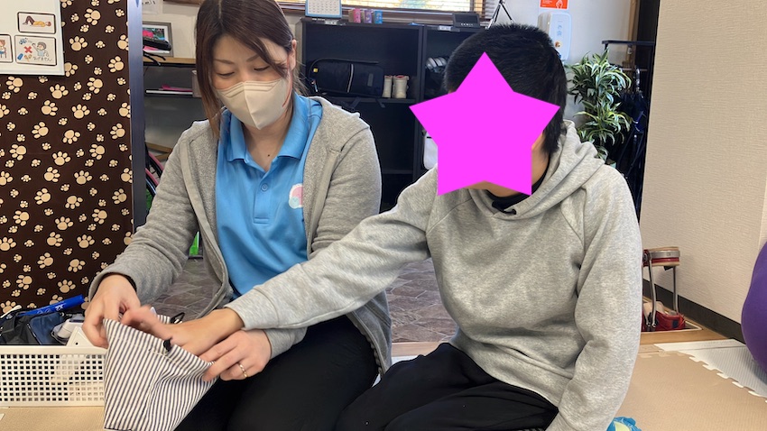 本日2回目のご利用です。療育としては関節可動域訓練・呼吸訓練・座位訓練を行いました。呼吸訓練は胸の動きを良くする運動を行いました。