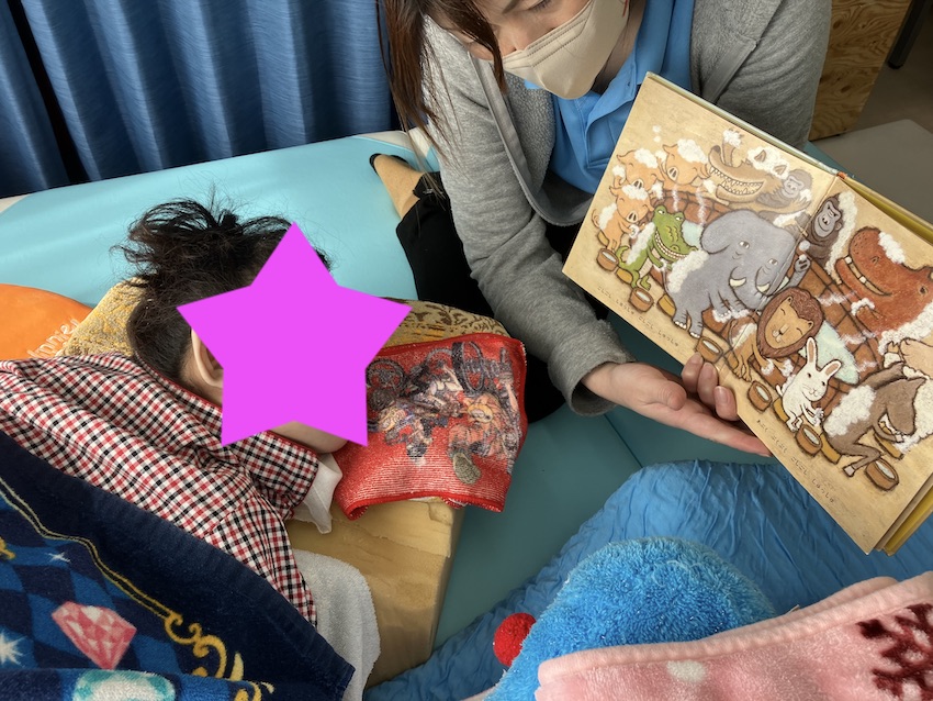 本日中高生は学校休業日でした。午前より支援を行いました。うつ伏せを行いながら読み聞かせをしている写真です。写真を加工している関係で目線や表情までお伝えできませんが、目線は絵本を注視しています。リラックスしている聴覚刺激が入りやすいので、読み聞かせの刺激は大変良いです。単にリラックスだけではなく、リラックスした状態で何をするかが重要です。療育で良い刺激を入れていきたいです。