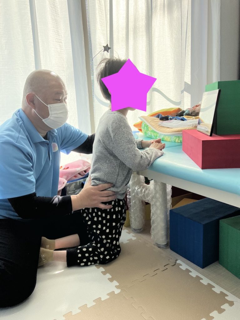 写真のお子様は、事業所に来ると必ず最初に膝立ちを行います。理由としては膝立ちを行いながら理学療法士が骨盤を誘導して良い姿勢をとる様にしています。これを行うとこの後の立つ練習や座る練習で良い姿勢をとる事ができます。タブレットを見ながら行っていますが、姿勢としては良い姿勢が取れていると思います。