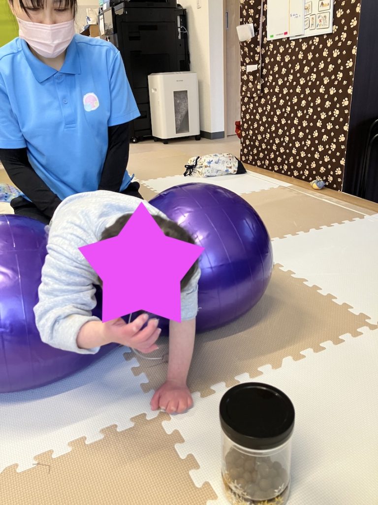 四つ這いへの移行を目的にピーナッツ型のバランスボールで四つ這いを行いました。手に注目していただきたいですが、左手が床に着いています。指はグーになっています。少ないですが左上肢で体重を支えています。昨日も書かせて頂きましたが、手で体重を支える練習は四つ這い動作に必要ですが、手や指の発達にも大変重要です。写真のお子様は昨年9月よりウェルスマイルを利用してくださっています。利用当初は両手への意識が少なかったので両手の動作を取り入れ、両手の意識が出てきた所で手に体重をかけてたくさん刺激を入れて手を使えるように療育を行っています。