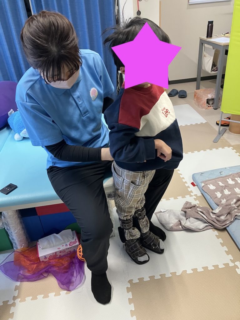 足を横に広げて立った時と足を閉じた立った時の大きな違いは、足を閉じた場合横へのバランスがとりにくい(横に倒れやすい)という事です。言い換えると、横へのバランスが良くならないと足を閉じて立つ事ができません。写真のお子様は少しずつですが、立つバランスが良くなってきたと考えます。私たち理学療法士はお子様方の日々の変化を見逃さないように療育を行っています。