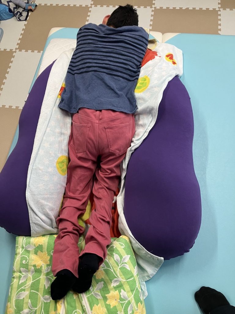 うつ伏せを行いながら足のストレッチを行いリラックスしている写真です。うつ伏せを行った直後は、膝が曲がり足が交叉する姿勢でしたが、時間が経つにつれてリラックスし足も伸びてきました。この時は無理に顔を上げる事も無く不随意運動も出ませんでした。緊張が高い状態が続くと本人も辛いです。ひと時でも良いのでリラックスできる事が療育の目的の一つです。