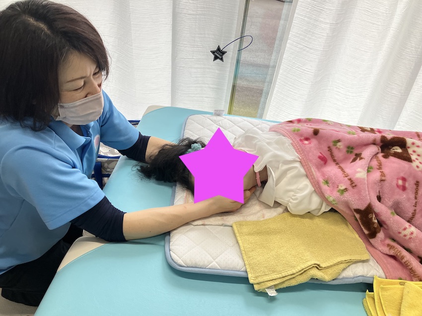 うつ伏せを行った後に首のストレッチを行いました。昨日調子が悪かったとの事で心配しましたが、本日は元気に来てくれて安心しました。うつ伏せ後に首のストレッチを行うと動かしやすいです。首を動かすと肩周辺が柔らかくなります。目標である自分の手を見る事に一歩ずつ近づいています。