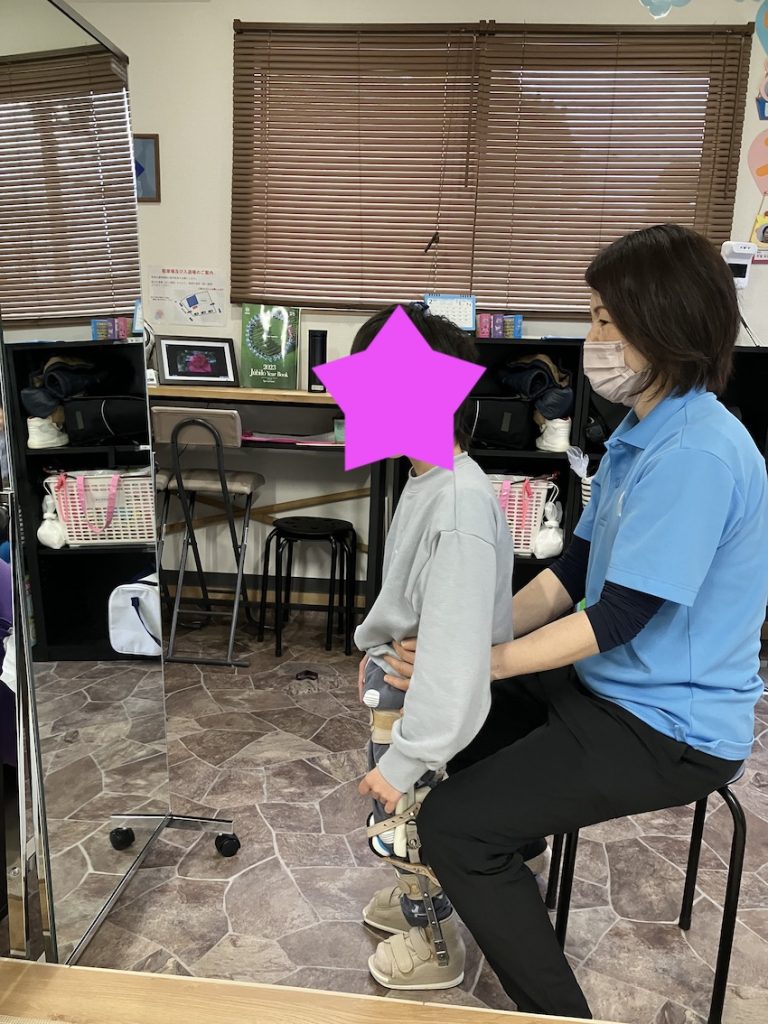 装具で立つ練習をしました。膝立ちで骨盤を動かす練習を取り入れてから、背中をそって立つ姿勢が少なくなってきました。骨盤の自己コントロールが上手になってきました。骨盤のコントロールが出来てくると、足の振り出しが行いやすくなります。無理のない範囲で積極的に歩行に向けて療育を続けていきたいです。