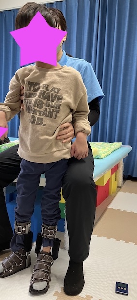 来所してから直ぐは少し眠そうでしたが、後半は覚醒して立つ練習も積極的にできました。いつも通り装具をつけて立ちました。足腰も以前に比べてしっかりしてきて、骨盤の介助で立位を保持できる様になってきました。この姿勢が取れる様になってきたら次は左右の足に体重を乗せていく練習です。今までは左右均等に体重を乗せる様に誘導しましたが、片足の比重を多くして体重が乗っていない足を動かせる様に介助して行きます。これが歩行練習の第一歩となります。