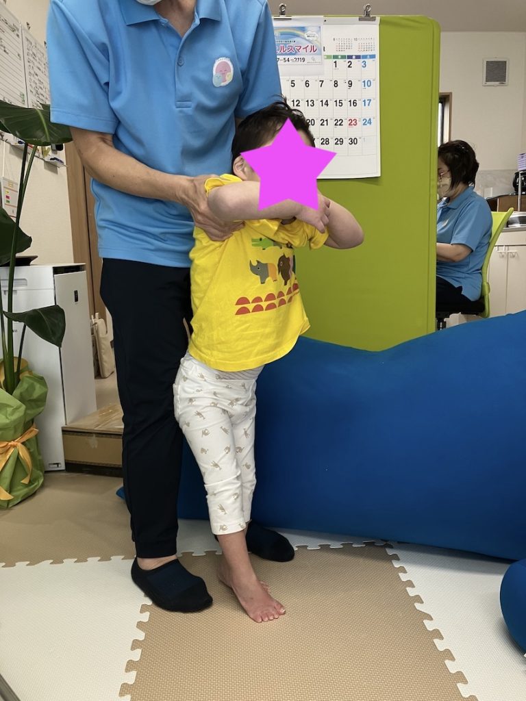今日利用して頂いたお子様です。脇を支持して立位の介助をすると下肢が突っ張ります。膝が伸びるのは良いですが、足首も伸びてしまいます。足の裏に刺激が入ると反射的に足全体が突っ張ります。これを「陽性支持反射」と言います。写真のお子様の場合、足裏の感覚が少し過敏であることも原因の一つです。