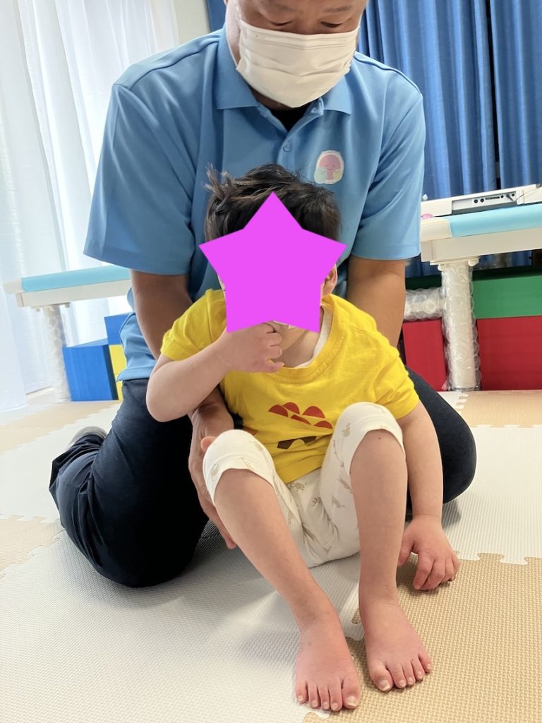 この後、写真のお子様の保護者様がお迎えに来た際に今日の内容をお話ししたところ、自宅で保護者様が胡座で座り、お子様の足裏がつく様に座らせる事があるとお聞きしました。まさに、本日行った事をすでに実践されており大変驚きました。