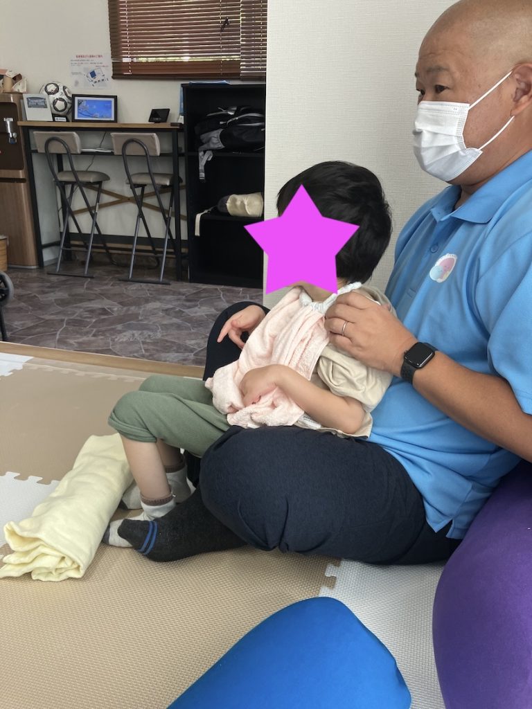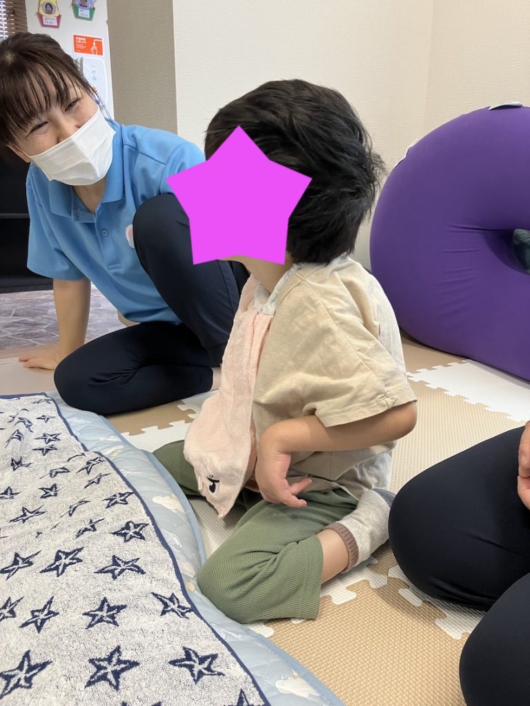 まずは骨盤と体幹を支持して固定し座位を取りました。首(頭)をわざと支えないで、自分でコントロールする練習をしました。時々頭が下がってしまうこともありましたが、自分で頭を持ち上げることができる様になってきました。また、前を向いている時は頭をまっすぐ保持できる時間が長くなりました。写真にはありませんが、その後保育士による本の読み聞かせをしました。